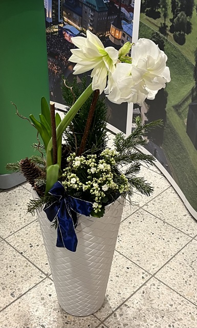 Kaupungintalon jouluinen kukka-asetelma toivotti tervetulleeksi Diandran konserttiin 17.12.2023